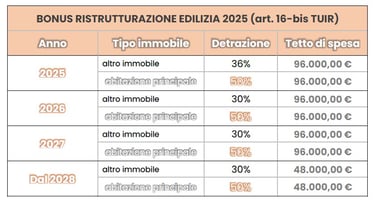 Di seguito proponiamo una tabella di sintesi con le detrazioni per ristrutturazione edilizia 2025 e anni successivi.