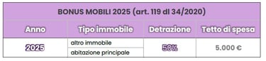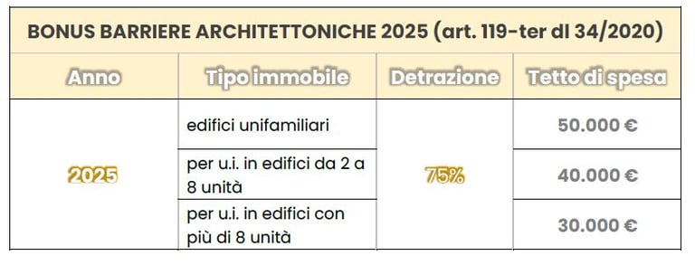 Di seguito la tabella di sintesi relativa al bonus barriere architettoniche 2025.