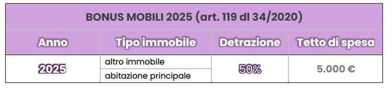 Il bonus mobili viene riconfermato per il 2025 con le medesime regole del 2024. Non si applicherà la limitazione delle abitazioni principali: pertanto, chi beneficia del bonus casa con detrazione del 50% o del 36% (abitazione principale o altro immobile), potrà usufruire di un bonus del 50% di detrazione sulle spese per l’acquisto di mobili ed elettrodomestici.