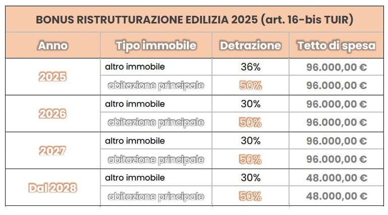 Dal 2028 il bonus ristrutturazione consisterà in una detrazione stabile del 30% con un tetto di spesa di 48.000 €.